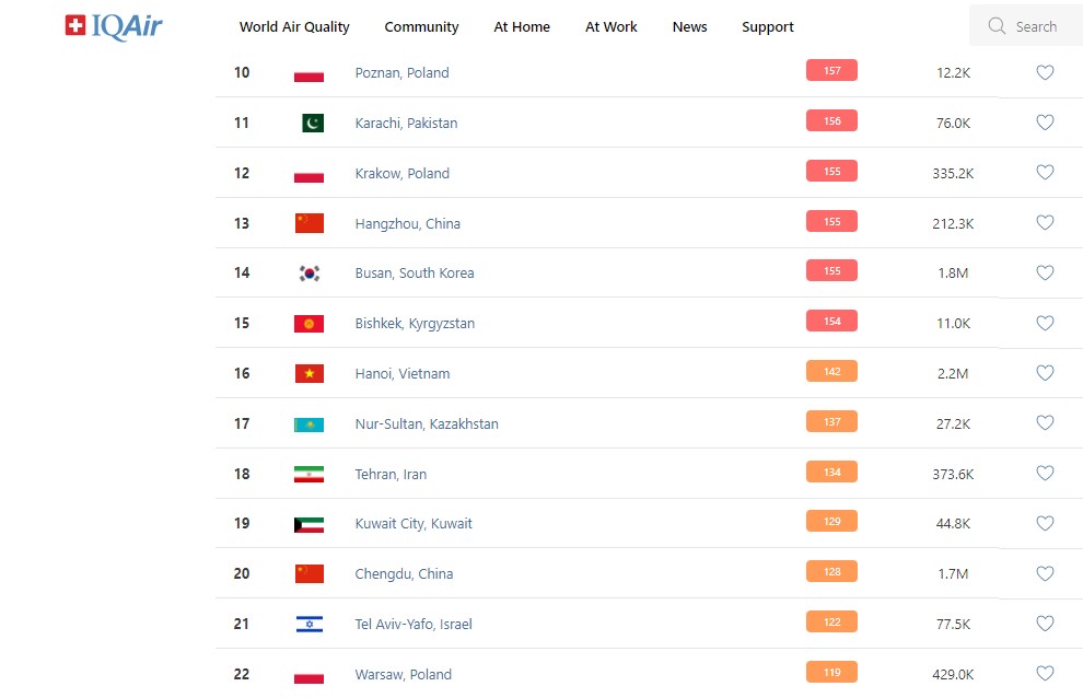 В 18.00 статус города отмечен как «нездоровый». Индекс качества воздуха, по данным сайта, составляет 154 (AQI).