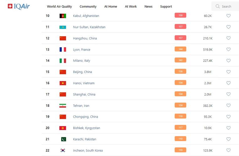 В рейтинге крупнейших городов мира по качеству воздуха World Air Quality Бишкек поднялся на 20-е место.