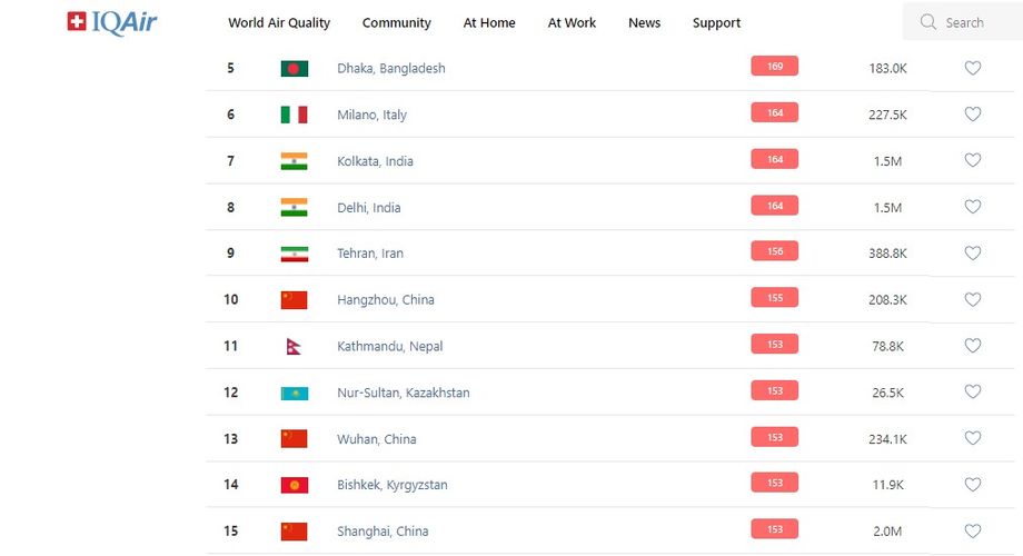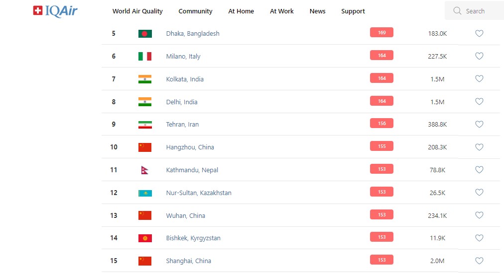В 18.00 статус города отмечен как «нездоровый». Индекс качества воздуха, по данным сайта, составляет 153 (AQI).