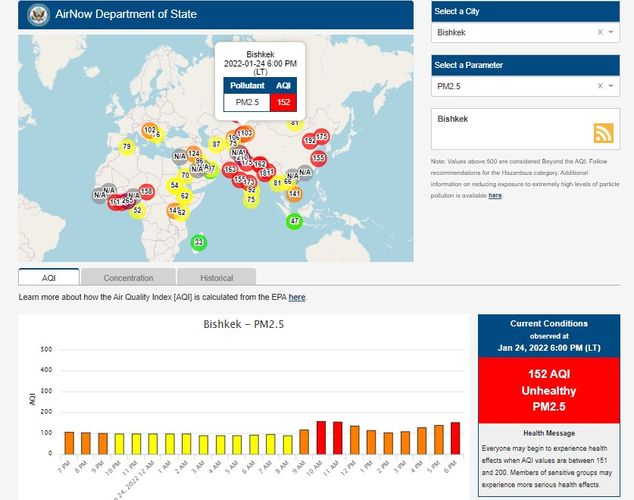 Посольство США в Кыргызстане также установило станцию. Информация обновляется каждый час. Индекс качества воздуха в районе дипломатической миссии — 152 (AQI).