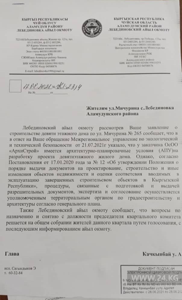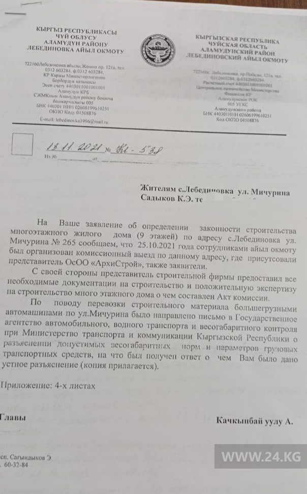 В селе Лебединовка на улице Мичурина строительная компания «Архи строй» возводит девятиэтажный дом впритык к уже существующим. Об этом 24-kg.com сообщил местный житель Нурсултан Болатов.