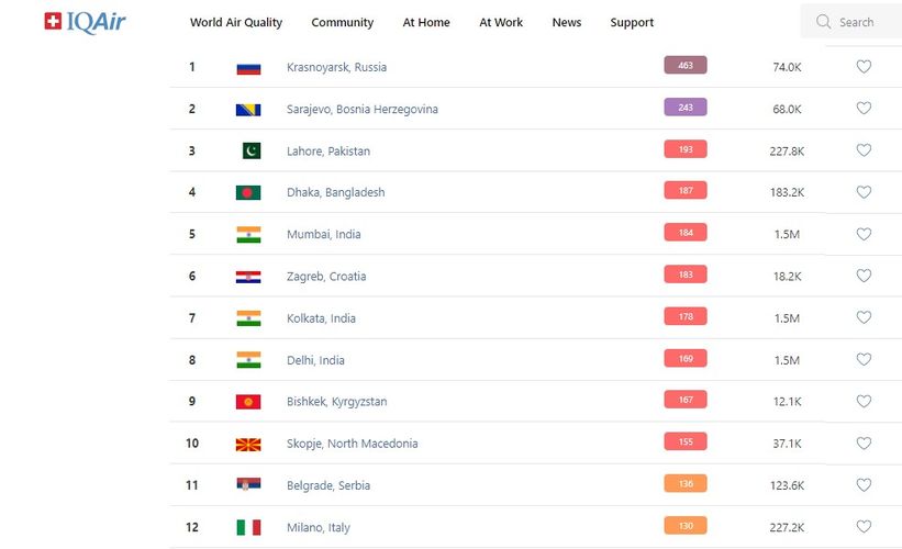В рейтинге крупнейших городов мира по качеству воздуха World Air Quality Бишкек поднялся на 9-е место.