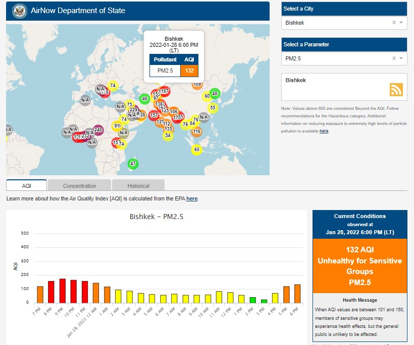 Посольство США в Кыргызстане также установило станцию. Информация обновляется каждый час. Индекс качества воздуха в районе дипломатической миссии — 132 (AQI).