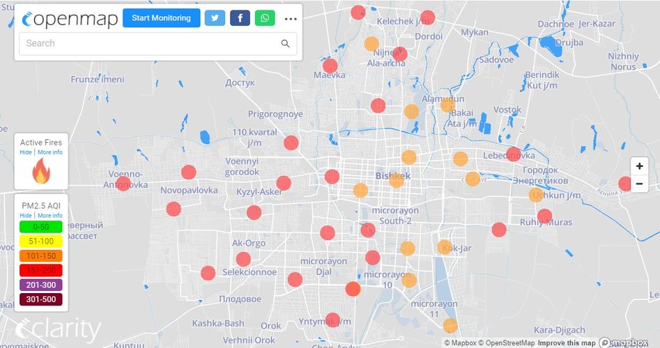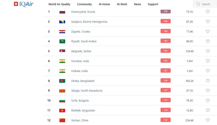 В рейтинге крупнейших городов мира по качеству воздуха World Air Quality Бишкек находится на 11-м месте.