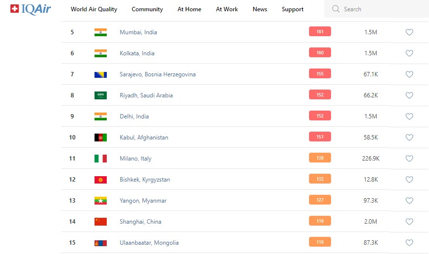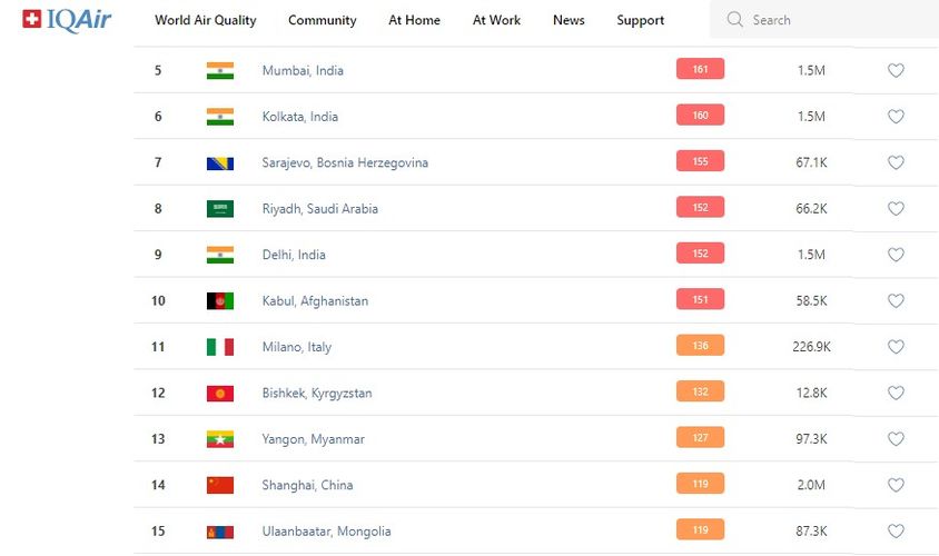 В рейтинге крупнейших городов мира по качеству воздуха World Air Quality Бишкек опустился на 12-е место.