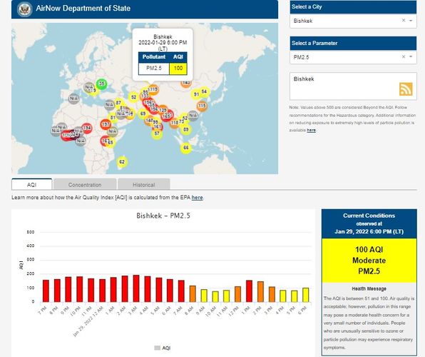 Посольство США в Кыргызстане также установило станцию. Информация обновляется каждый час. Индекс качества воздуха в районе дипломатической миссии — 100 (AQI).