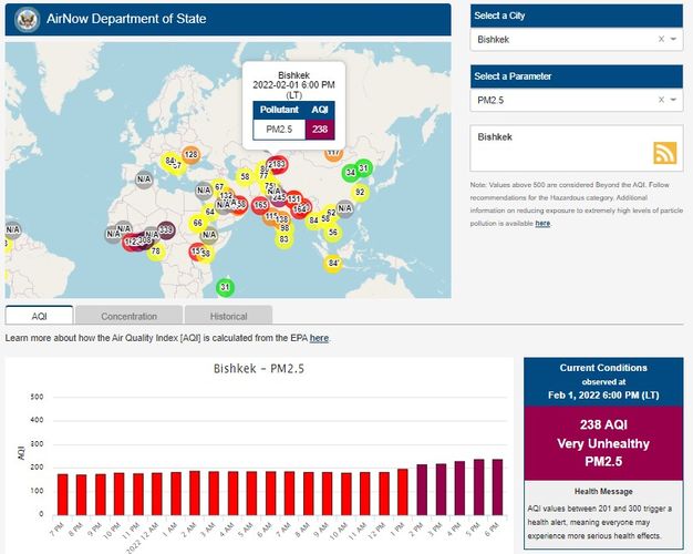 Посольство США в Кыргызстане также установило станцию. Информация обновляется каждый час. Индекс качества воздуха в районе дипломатической миссии — 238 (AQI).