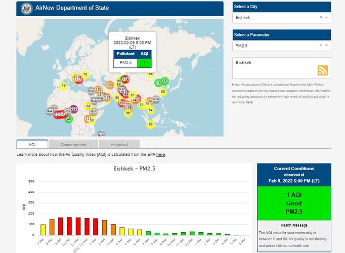 Посольство США в Кыргызстане также установило станцию. Информация обновляется каждый час. Индекс качества воздуха в районе дипломатической миссии — 1 (AQI).
