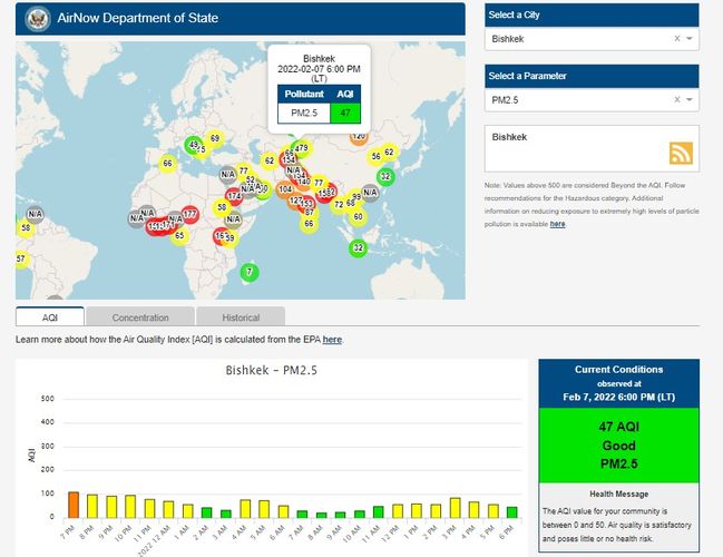 Посольство США в Кыргызстане также установило станцию. Информация обновляется каждый час. Индекс качества воздуха в районе дипломатической миссии — 47 (AQI).