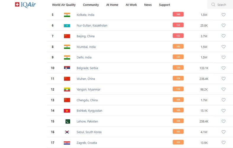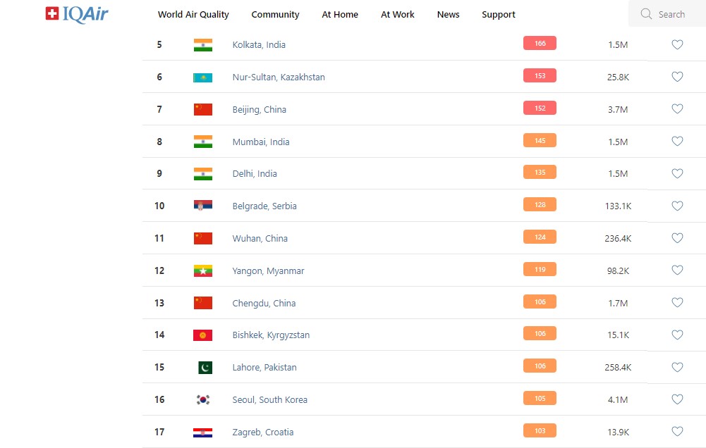 В рейтинге крупнейших городов мира по качеству воздуха World Air Quality Бишкек находится на 14-м место.