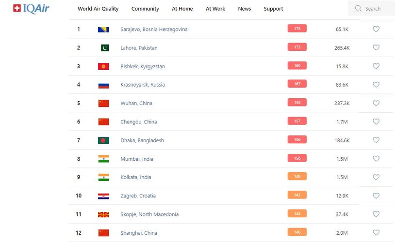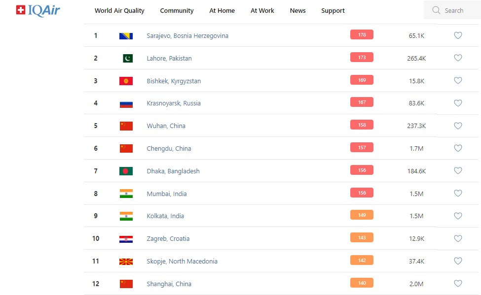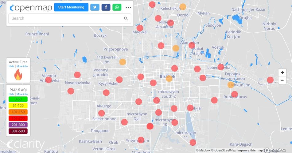 В рейтинге крупнейших городов мира по качеству воздуха World Air Quality Бишкек поднялся на 3-е место.
