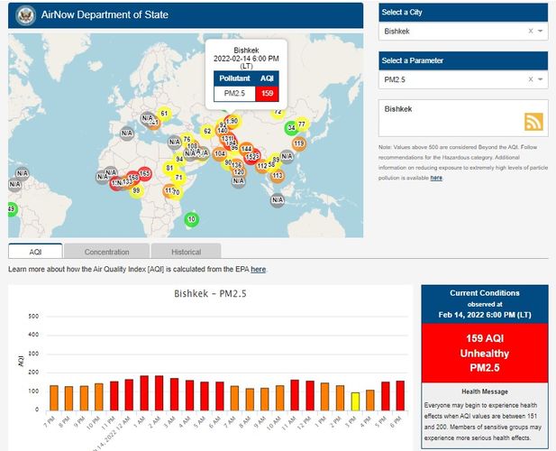 Посольство США в Кыргызстане также установило станцию. Информация обновляется каждый час. Индекс качества воздуха в районе дипломатической миссии — 159 (AQI).