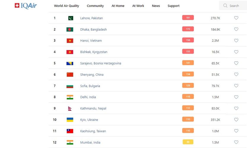 В рейтинге крупнейших городов мира по качеству воздуха World Air Quality Бишкек поднялся на 4-е место.