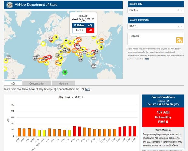 Посольство США в Кыргызстане также установило станцию. Информация обновляется каждый час. Индекс качества воздуха в районе дипломатической миссии — 167 (AQI).