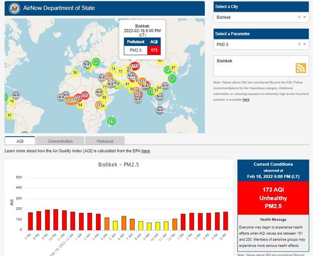 Посольство США в Кыргызстане также установило станцию. Информация обновляется каждый час. Индекс качества воздуха в районе дипломатической миссии — 173 (AQI).