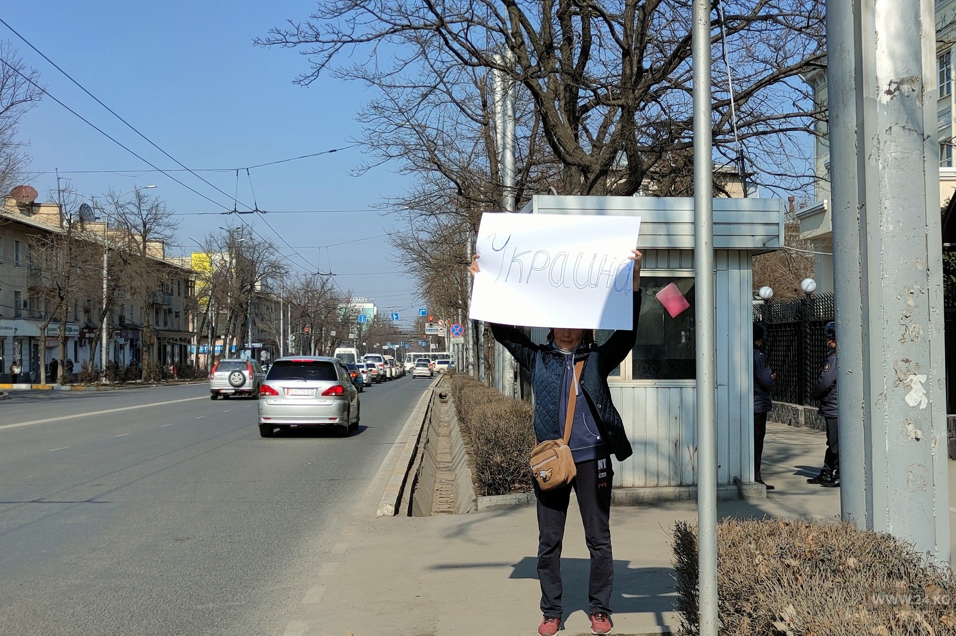 Горожанка Чолпонай Жолчуева вышла к посольству Российской Федерации в Кыргызстане с плакатом, на котором написано: «Украина».