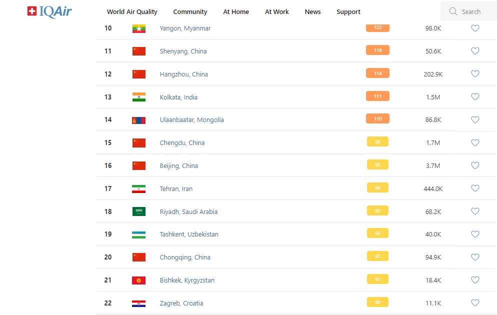 В рейтинге крупнейших городов мира по качеству воздуха World Air Quality Бишкек поднялся на 21-е место.