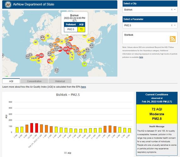 Посольство США в Кыргызстане также установило станцию. Информация обновляется каждый час. Индекс качества воздуха в районе дипломатической миссии — 72 (AQI).