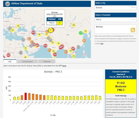 Посольство США в Кыргызстане также установило станцию. Информация обновляется каждый час. Индекс качества воздуха в районе дипломатической миссии — 81 (AQI).