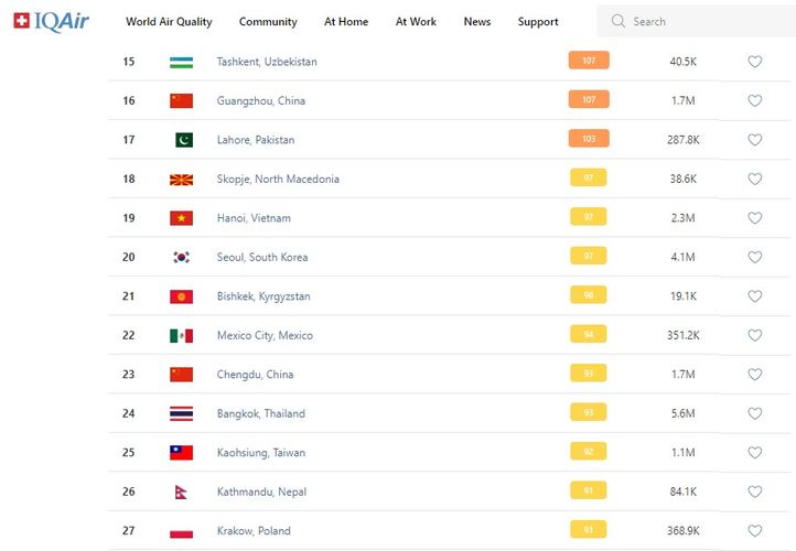 В рейтинге крупнейших городов мира по качеству воздуха World Air Quality Бишкек поднялся на 21-е место.