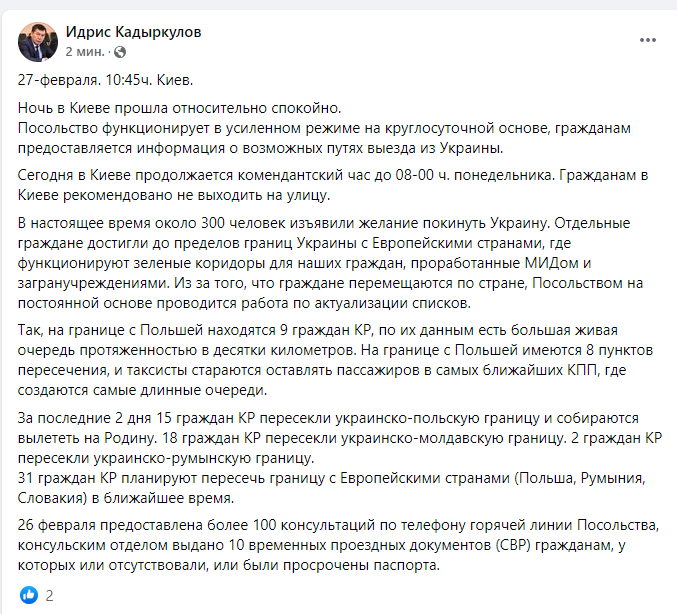 «Сейчас около 300 человек изъявили желание покинуть Украину. Некоторые кыргызстанцы самостоятельно добрались до европейской границы, где функционируют зеленые коридоры, открытые по согласованию с МИД КР», — отметил посол.