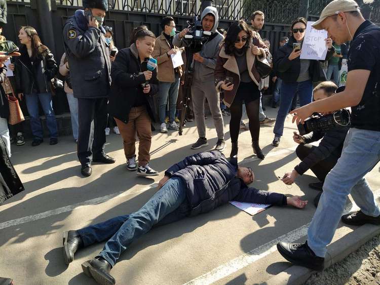 Гражданский активист Ондуруш Токтонасыров лег на землю, изображая мертвого, на акции протеста возле посольства России в Бишкеке.
