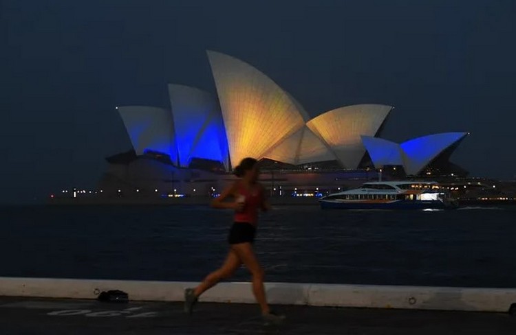 Оперный театр в Сиднее (Австралия) подсветили цветами украинского флага.