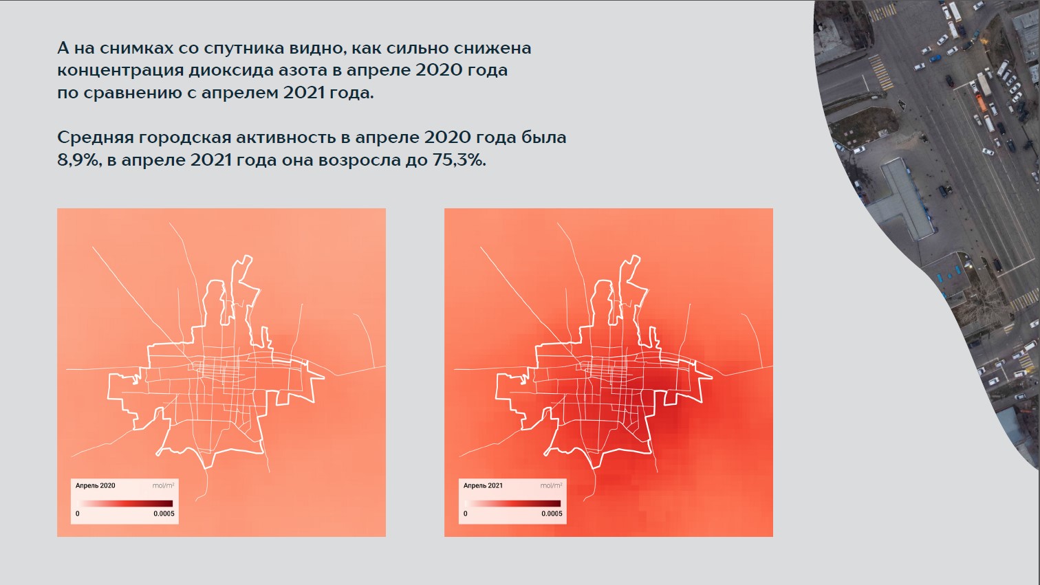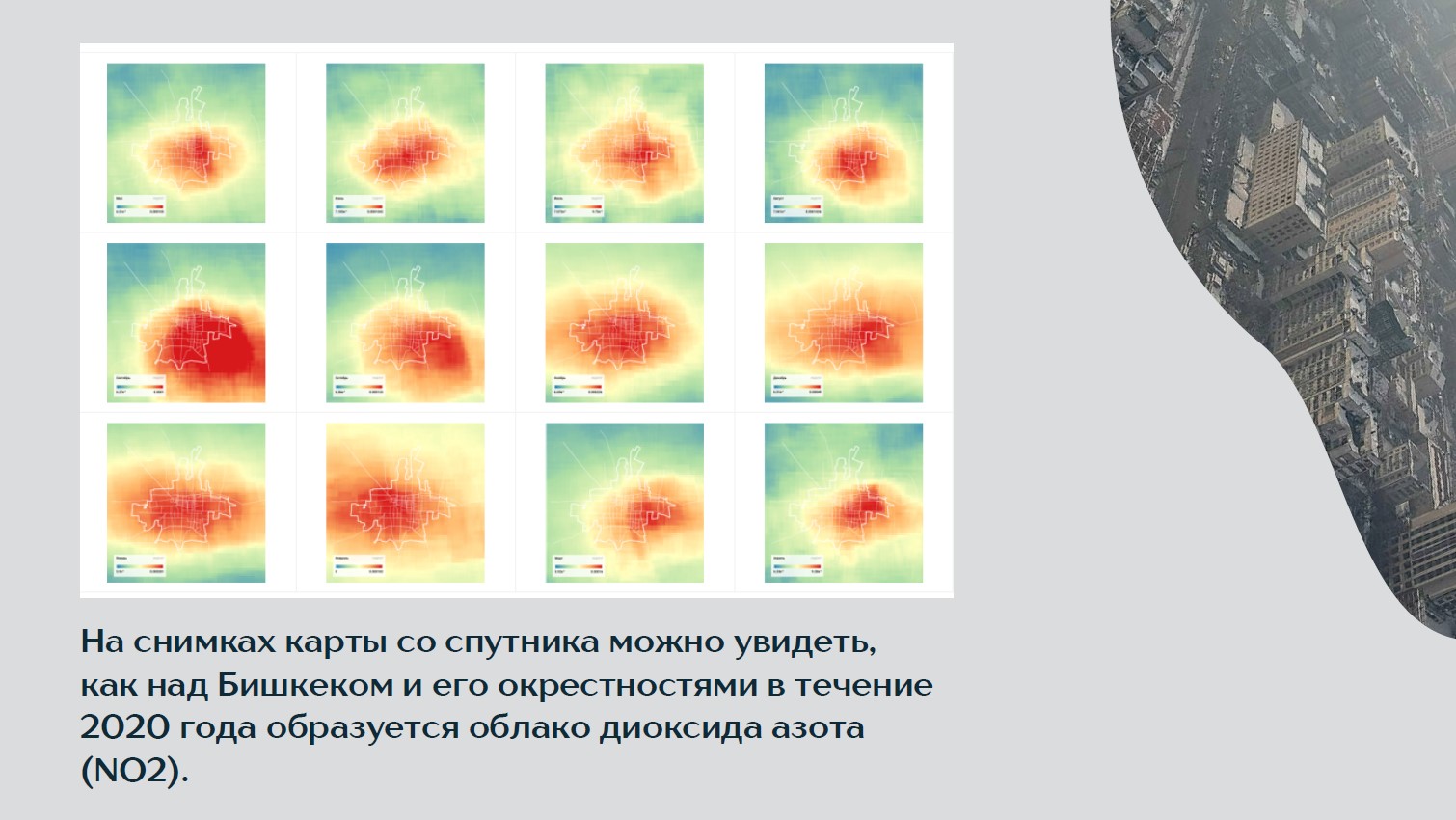 «И еще один момент, который подтверждает гипотезу, — данные городской активности, собранные «Яндексом» во время локдауна в апреле 2020 года с помощью своих сервисов. В апреле 2020-го в Бишкеке был локдаун, движение транспорта было ограничено, городская активность снизилась до 9 процентов (в апреле прошлого года она возросла до 75,3 процента). На снимках со спутника видно, как сильно снижена концентрация диоксида азота по сравнению с апрелем 2021-го. То есть существует прямая зависимость от транспортной активности», — пояснила Рада Валентина кызы.