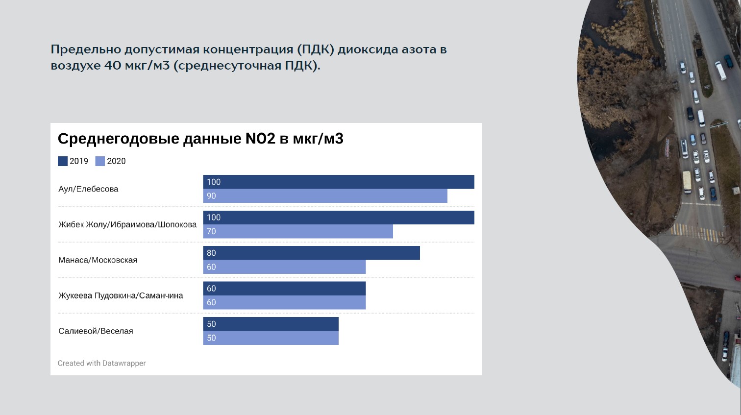Предельно допустимая среднесуточная концентрация NO2 в воздухе — 40 мкг/м3. И, по показаниям этих ПНЗ (среднегодовые данные), самый грязный перекресток — это Аул/Елебесова, затем идет Жибек Жолу/Ибраимова, потом Манаса/Московская.