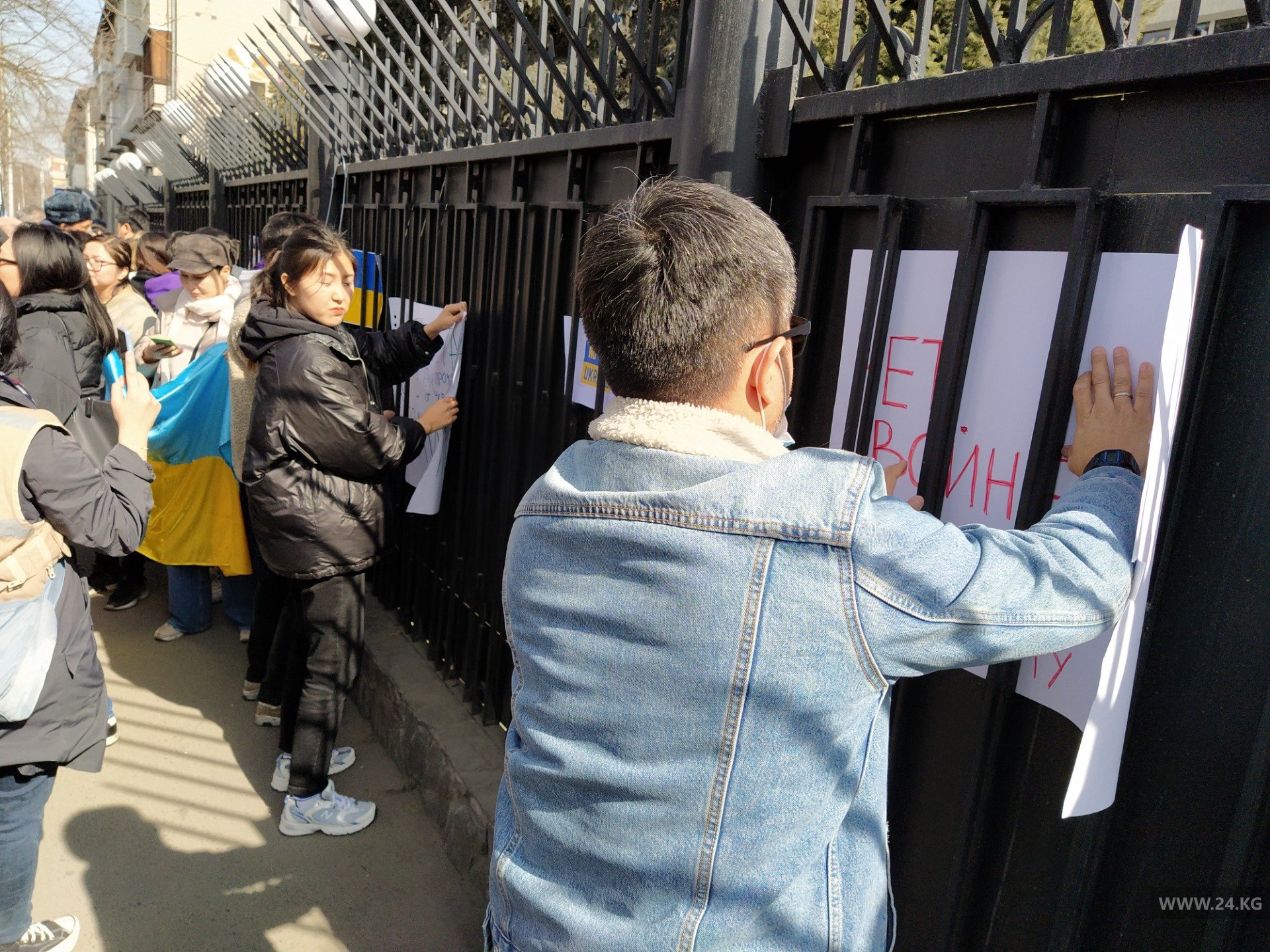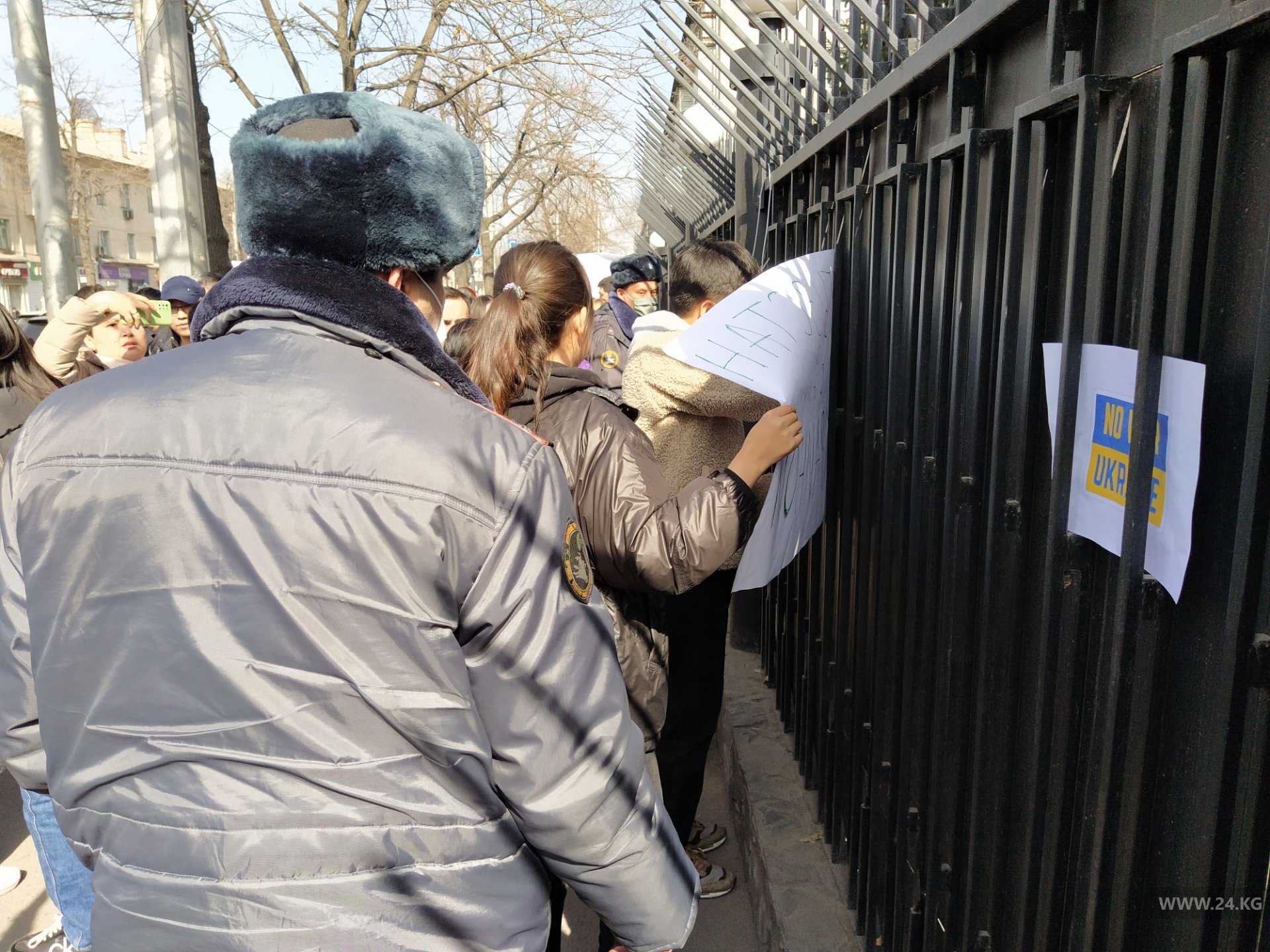Собравшиеся у посольства Российской Федерации в Бишкеке на антивоенную акцию призвали власти Кыргызстана осудить позицию Кремля.