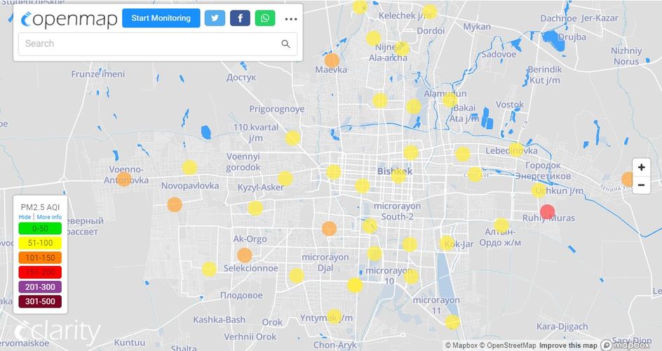 Посольство США в Кыргызстане также установило станцию. Информация обновляется каждый час. Индекс качества воздуха в районе дипломатической миссии — 82 (AQI).