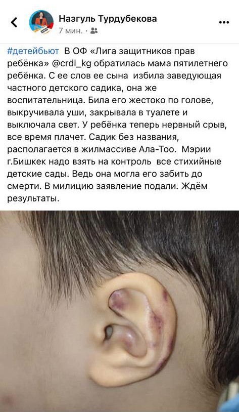 «Со слов матери, ее сына избила заведующая частным детским садом, она же воспитательница. Била его жестоко по голове, выкручивала уши, закрывала в туалете и выключала свет. У ребенка теперь нервный срыв, все время плачет. Садик без названия, располагается в жилмассиве «Ала-Тоо». Мэрии Бишкека надо взять под контроль все стихийные детские сады», — написала Назгуль Турдубекова.