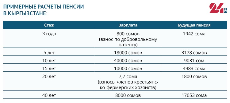 Допустим, у вас 15 лет стажа, а зарплата составляет 10 тысяч сомов. Ваша пенсия будет 4 тысячи 983 сома (в том числе 3,2 тысячи сомов в виде страховой части, а 1,78 тысячи — базовой).Если у вас зарплата чуть выше (18 тысяч сомов), но стаж в три раза меньше (пять лет), то пенсия составит 3 тысячи 178 сомов (в том числе 1 тысяча 398 сомов — страховая часть и 1 тысяча 780 — базовая).