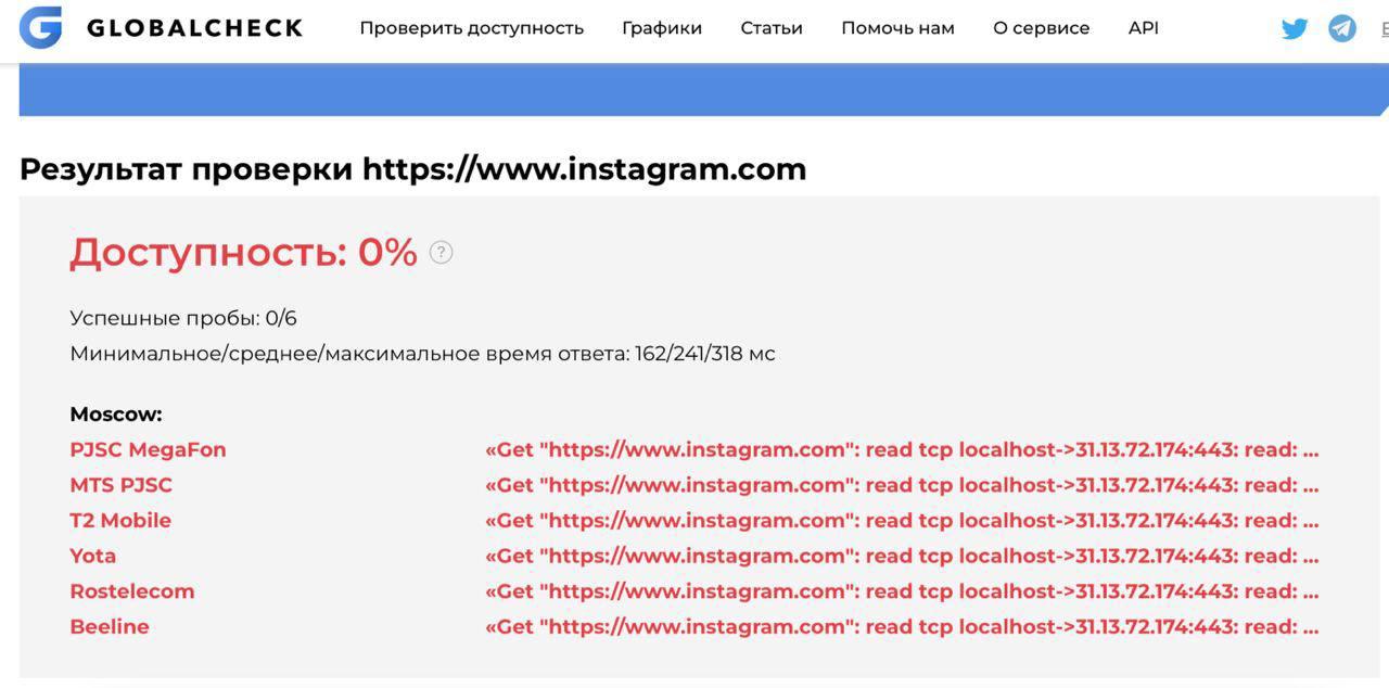 Instagram официально заблокирован в России, доступность составляет 0 процентов — GlobalCheck.