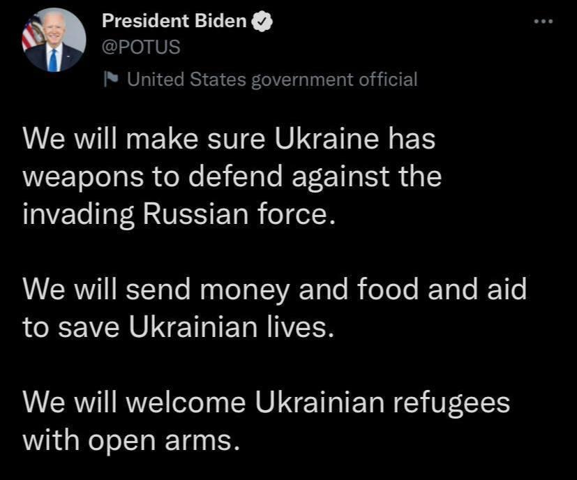 Джо Байден написал твит в своем Twitter: «Мы позаботимся о том, чтобы у Украины было оружие для защиты от российского вторжения. Мы предоставим деньги, еду и поддержку, чтобы спасти жизнь украинцев. Мы будем приветствовать украинских беженцев с распростертыми объятиями».