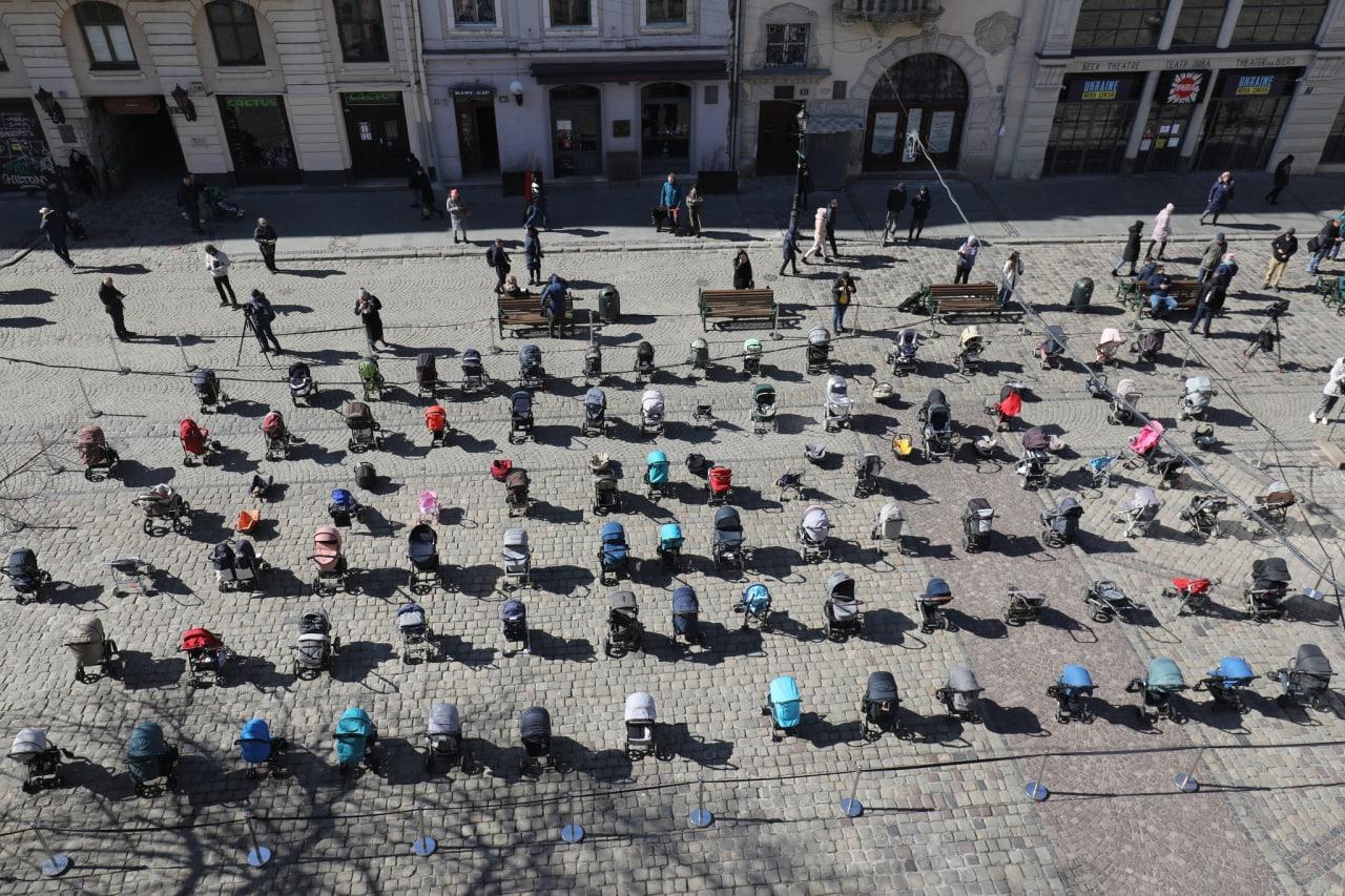 Во Львове на площади Рынок поставили 109 пустых детских колясок. Столько детей погибло с начала военных действий в Украине.