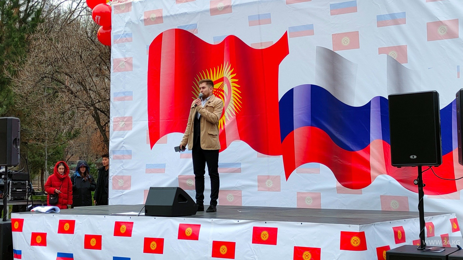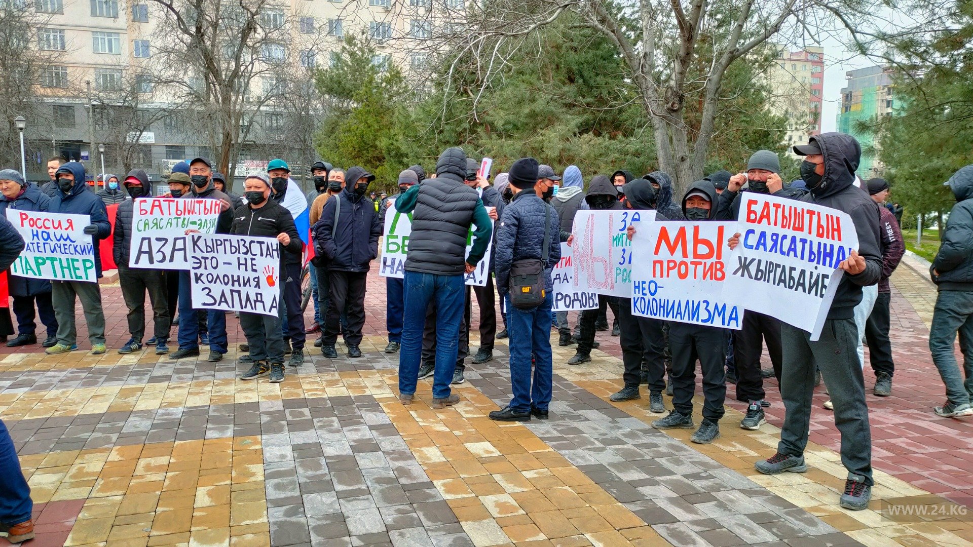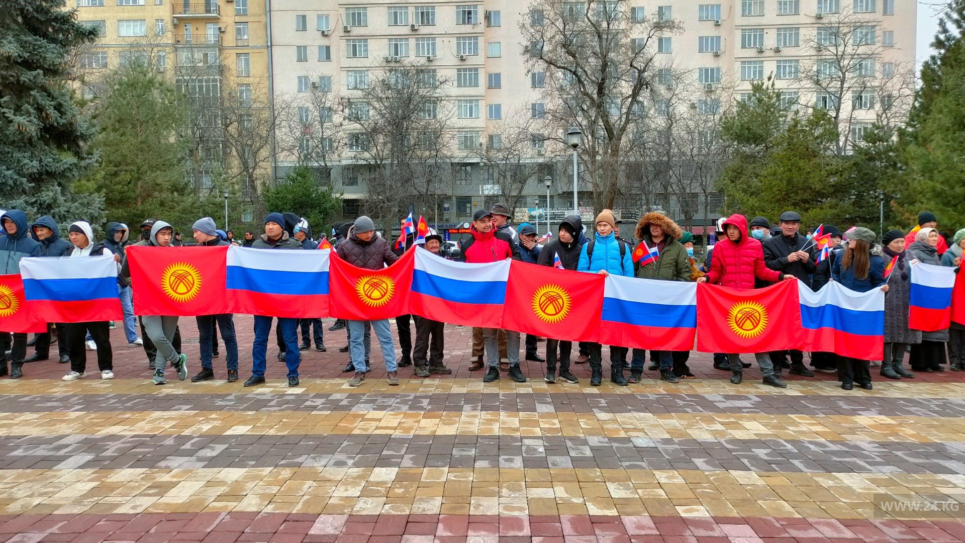 Участники также приветствуют действия Москвы в Украине и развернули плакаты в поддержку мигрантов, которые находятся на заработках в РФ. В анонсе акции, который распространяли в соцсетях, говорилось, что это «митинг в поддержку действий России по ликвидации фашизма в Украине». Сегодня на мероприятии акцент смещен. Заявлено, что митинг организован в поддержку дружбы КР и РФ.