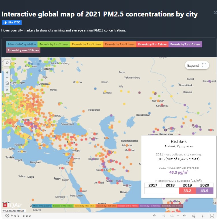 При этом Бишкек оказался на 105-м месте среди городов мира и на 9-м среди столиц. Среднегодовая концентрация PM2.5 превышена в семь-десять раз.