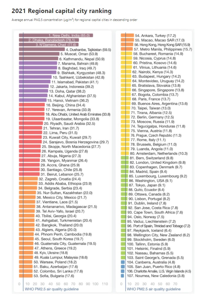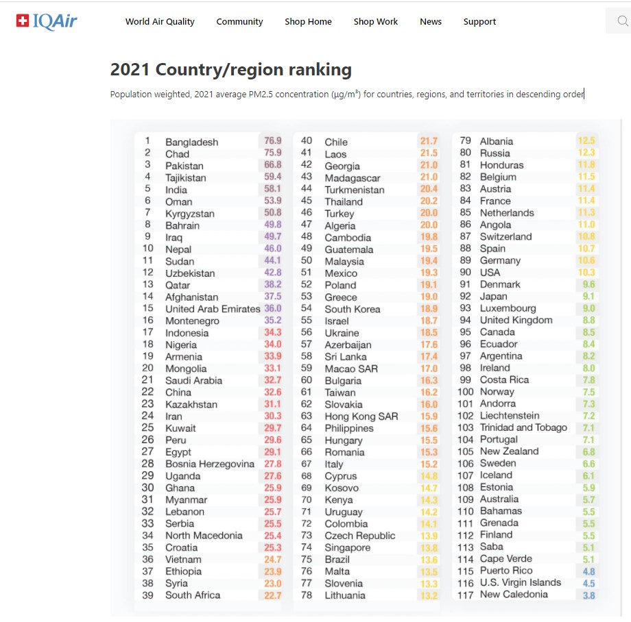 Китай за минувший год опустился с 14-го на 22-е место, при этом средние показатели концентрации PM2.5 составили 32,6 микрограмма на кубометр воздуха. Наряду с этим китайский город Синьцзян попал в тройку самых загрязненных городов планеты, уступив лишь индийским Бхивади и Газиабаду.