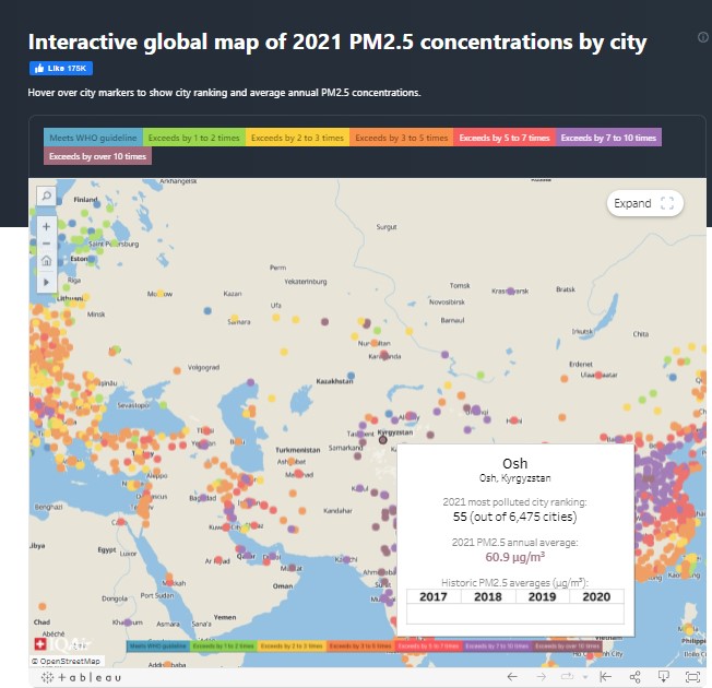 Ош занял 55-е место среди городов. В нем среднегодовая концентрация превышена более чем в десять раз.