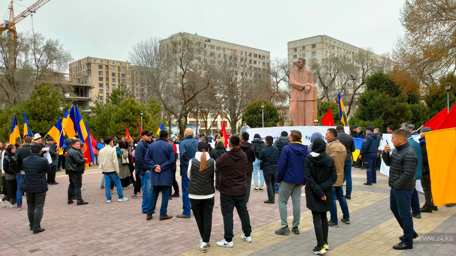 Митинг в поддержку Украины проходит в сквере имени Максима Горького. На акцию собралось примерно 100 человек. Они держат плакаты с надписями: «Нет войне!», «Кыргызстан с Украиной». Сотрудники милиции обеспечивают безопасность собравшихся и не препятствуют митингующим.