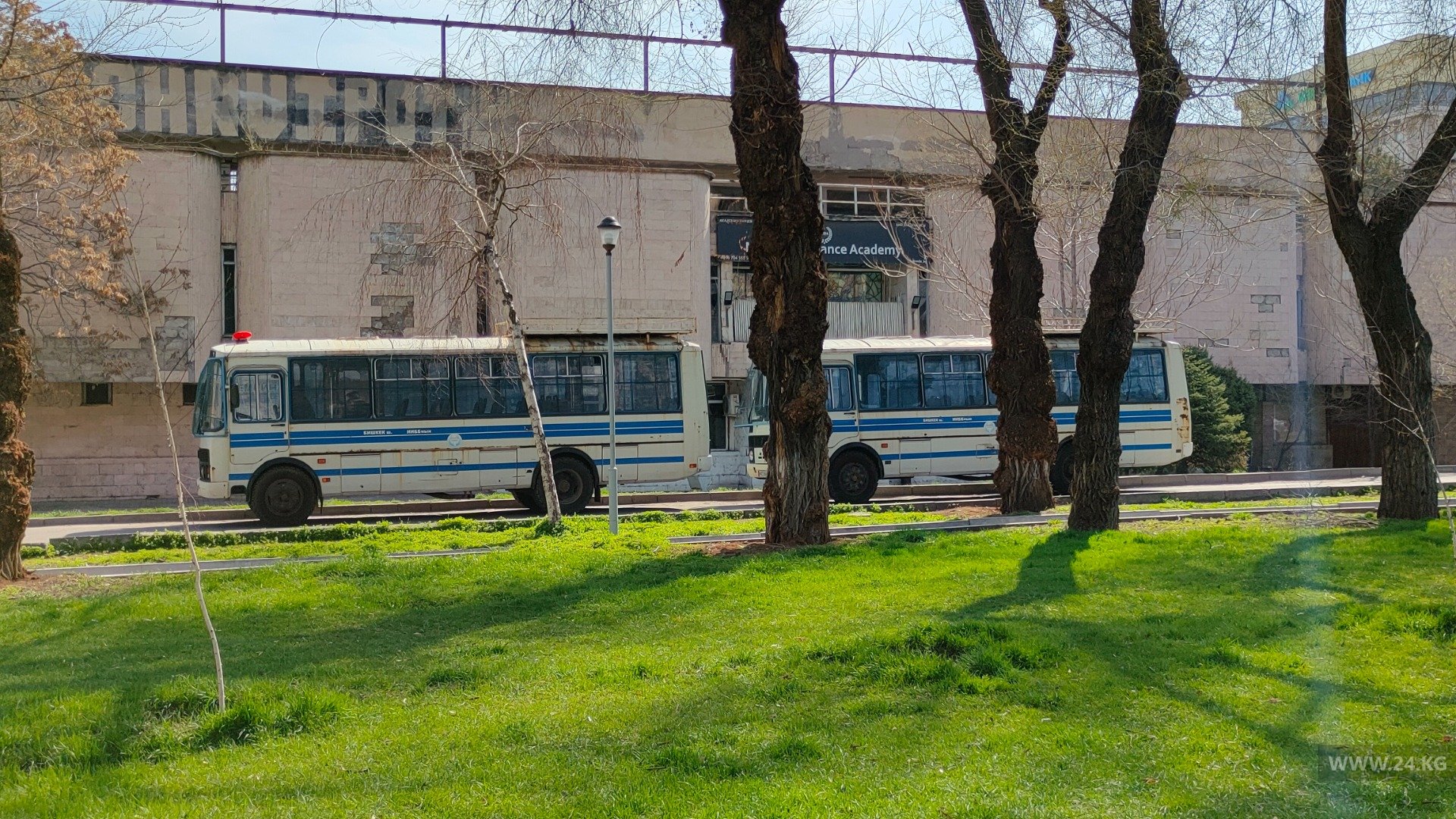 Возле сквера имени Максима Горького стоят два милицейских автобуса.