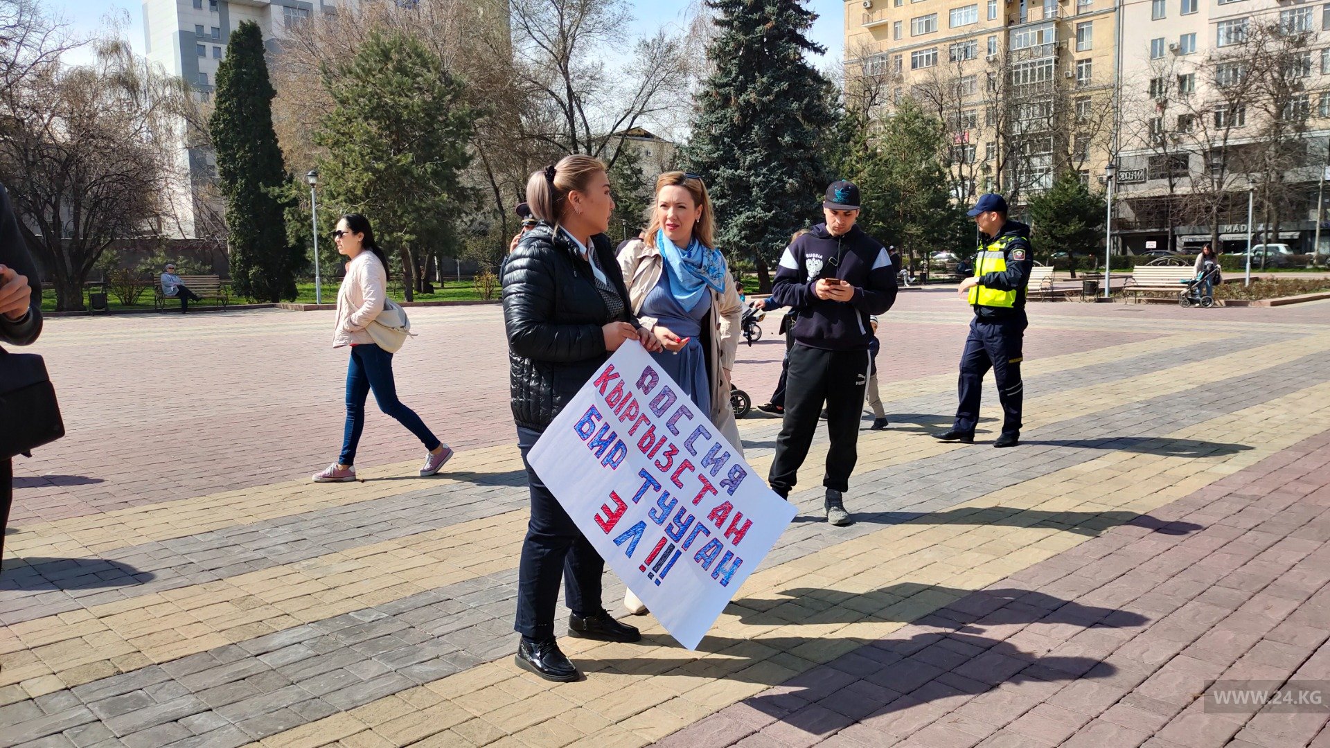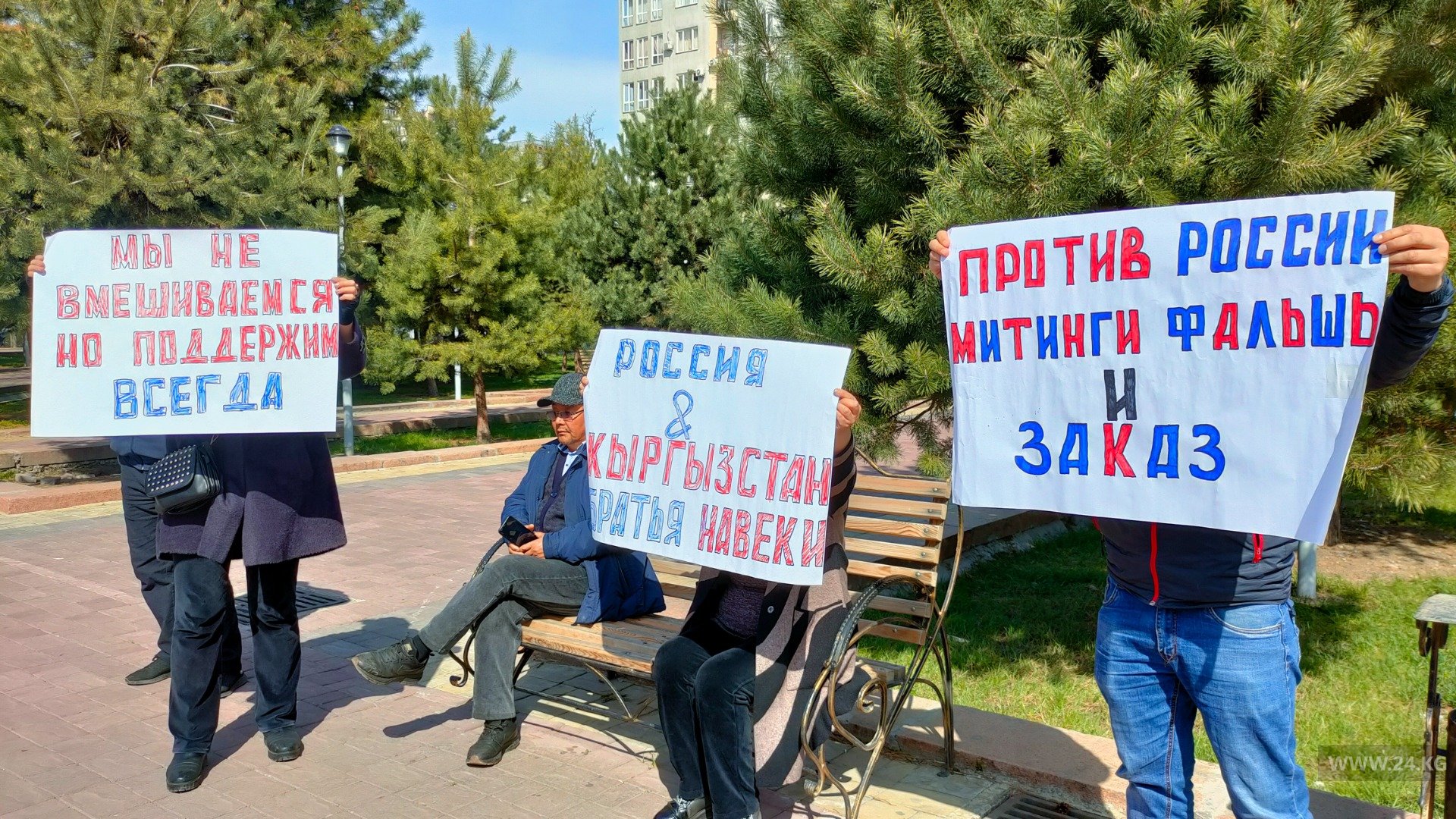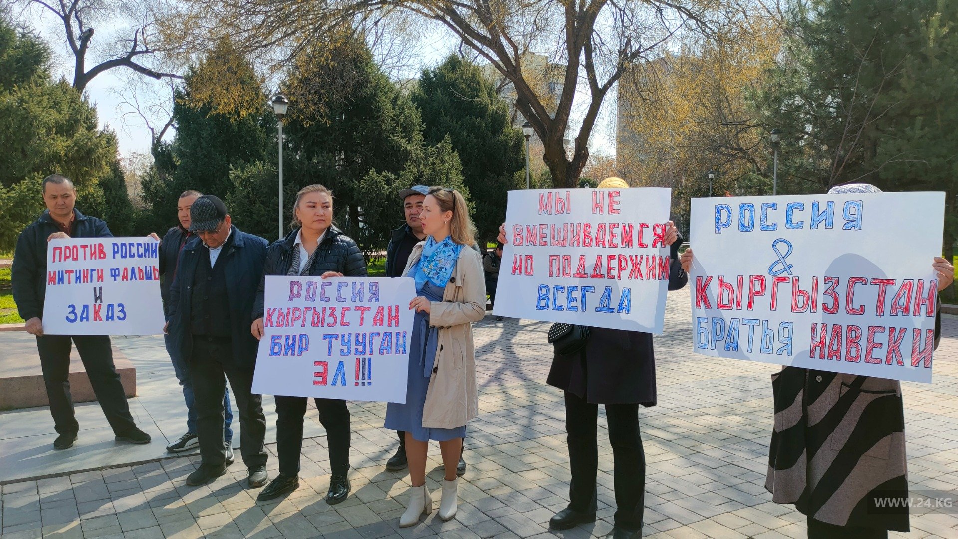 Ранее было заявлено, что в 11.00 здесь пройдет митинг в поддержку России. Общественный порядок на месте охраняют примерно десять сотрудников милиции. На митинг собралось девять человек, пришла также заслуженная артистка Кыргызстана Галина Кетова. Участники держат плакаты с надписями: «Россия и Кыргызстан — братья навеки!».