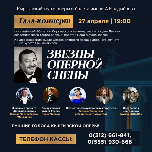 В Бишкеке 27 апреля состоится гала-концерт, посвященный 80-летию Кыргызского национального академического театра оперы и балета и дню рождения оперного певца, народного артиста СССР Булата Минжилкиева. Об этом сообщили в театре.