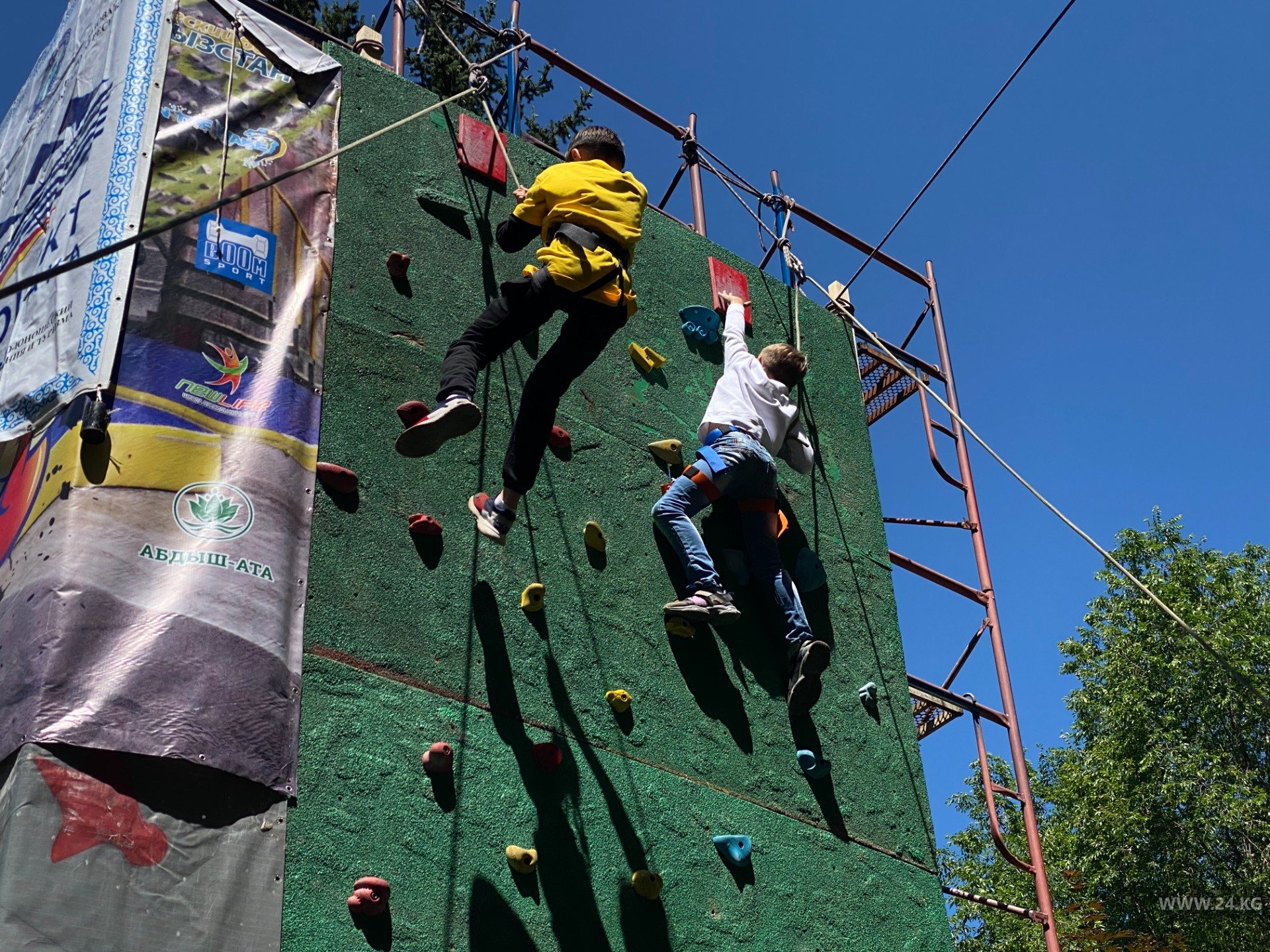 Одна из развлекательных зон вызвала особый интерес и у ребятни, и у мам с папами. К скалодрому выстроилась длинная очередь. Его установила в парке Федерация альпинизма Кыргызстана.