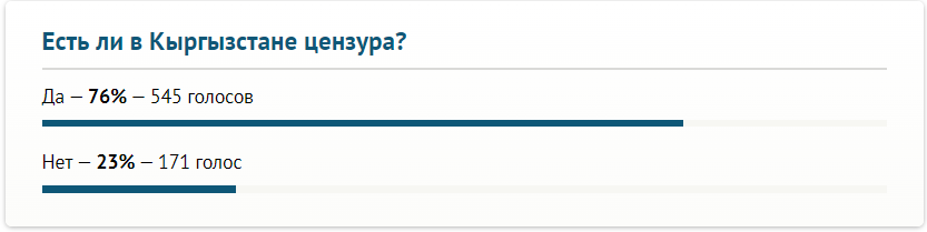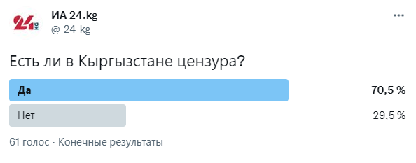 На странице 24-kg.com в Twitter опрос показал: 70,5 процента полагают, что цензура существует. 29,5 процента ответили отрицательно.