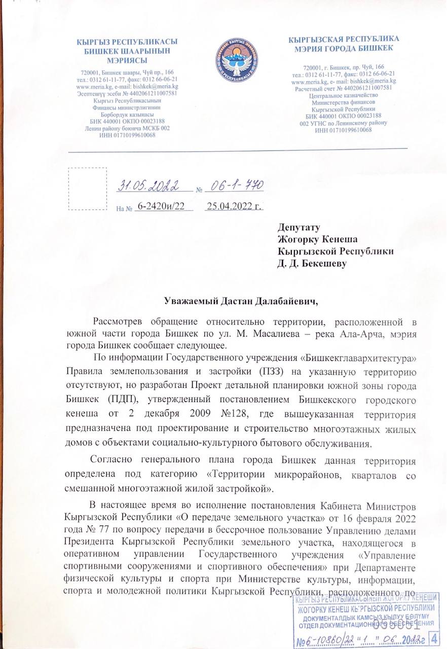 По словам нардепа, он получил ответ на запрос от мэрии столицы, где говорится, что правила землепользования и застройки на отрезок по улице Масалиева и побережью реки Ала-Арчи отсутствуют. Но разработан План детальной планировки, утвержденный постановлением БГК от 2009 года. Эта территория предназначена «для строительства многоэтажных жилых домов и объектов социально-культурного бытового обслуживания».