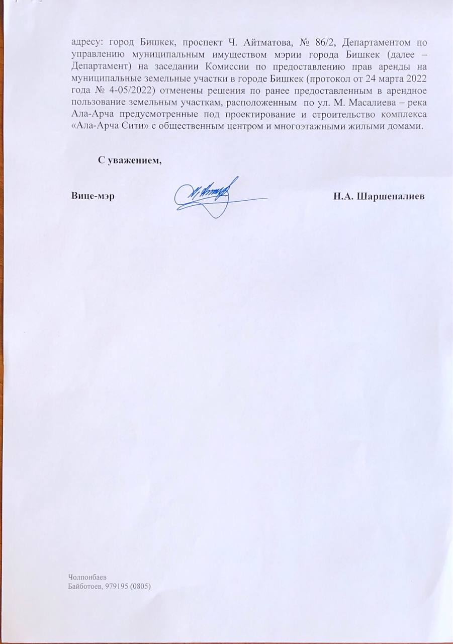 В пояснении муниципалитета также говорится, что в феврале кабмин поручил передать 16 гектаров земли на баланс управления делами президента. В марте комиссия по предоставлению прав аренды на муниципальные земельные участки отменяет ранее принятое решение о предоставлении указанного участка под строительство административного городка «Ала-Арча Сити».