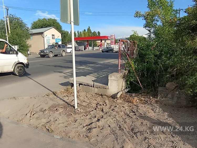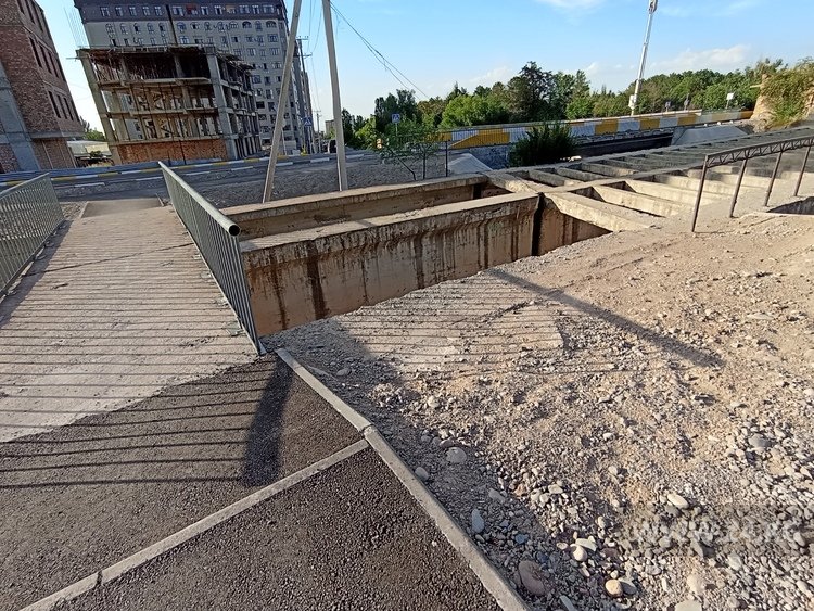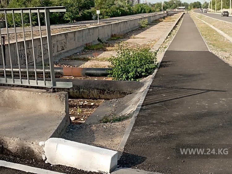 Самый дорогостоящий и сложный этап реконструкции дороги — строительство моста через реку Аламедин. И в то же время именно возле него очень много опасных мест. Когда идешь по тротуару по северной части со стороны Ботсада, забор заканчивается сразу за мостом, хотя остается еще большой участок, с которого запросто может упасть любопытный ребенок в реку Аламедин.
