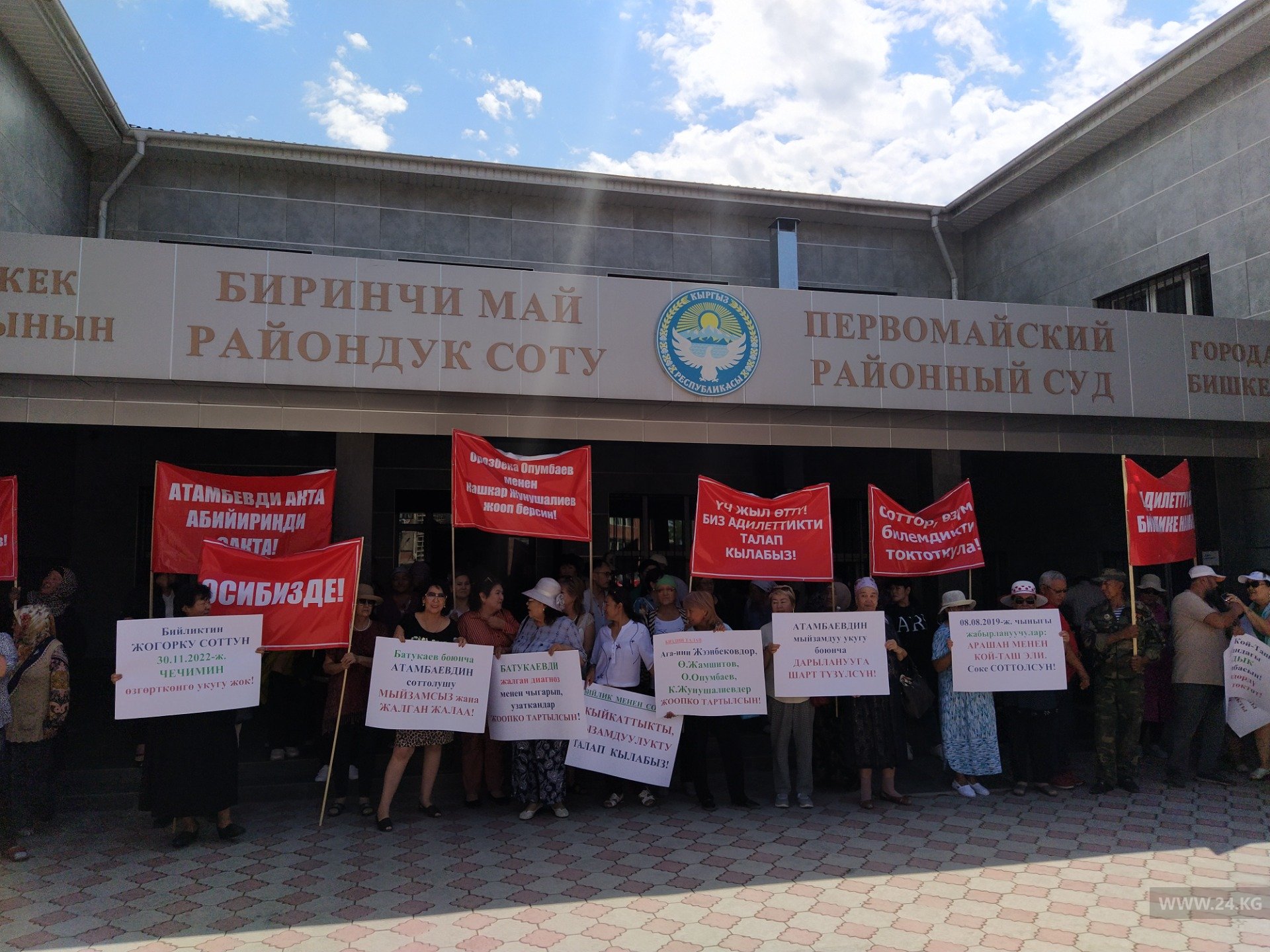 Участники акции держат в руках транспаранты и плакаты. Охраняющие здание суда сотрудники милиции потребовали вынести знамена и провести акцию за забором. В спор вмешались супруга обвиняемого Раиса Атамбаева и экс-депутат Жогорку Кенеша Ирина Карамушкина. После непродолжительного спора милиционеры уступили.